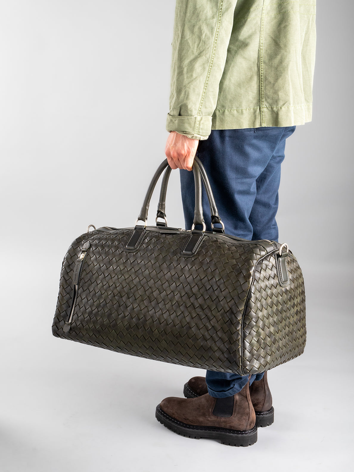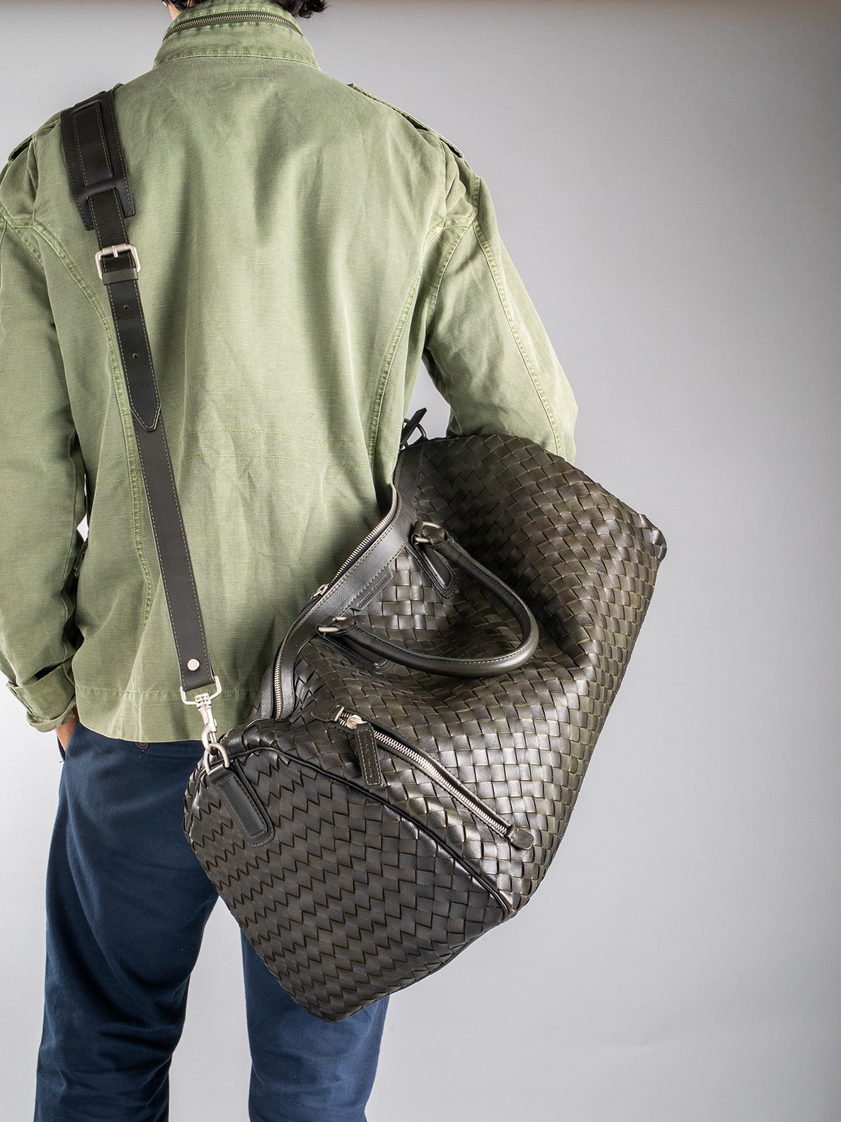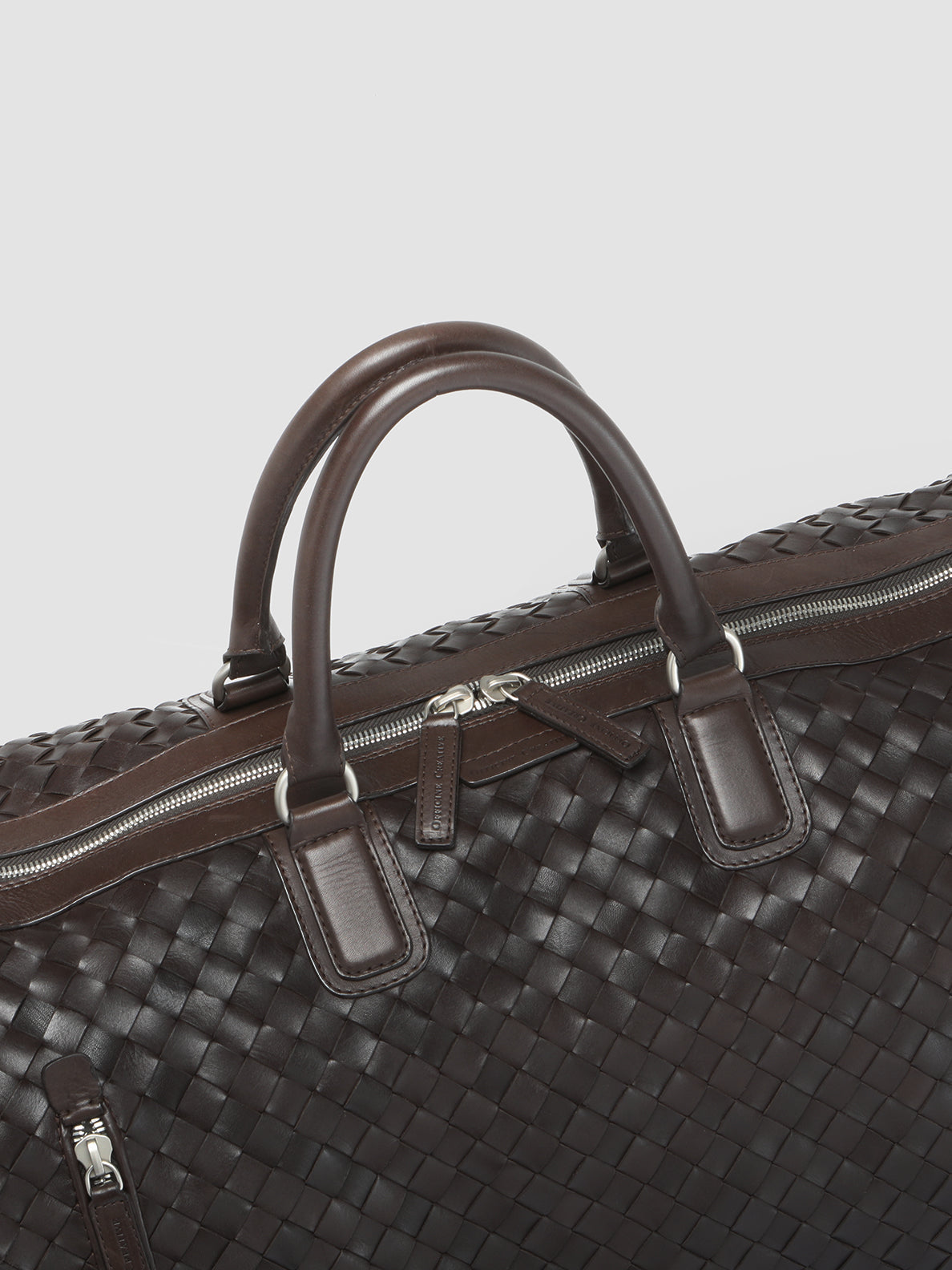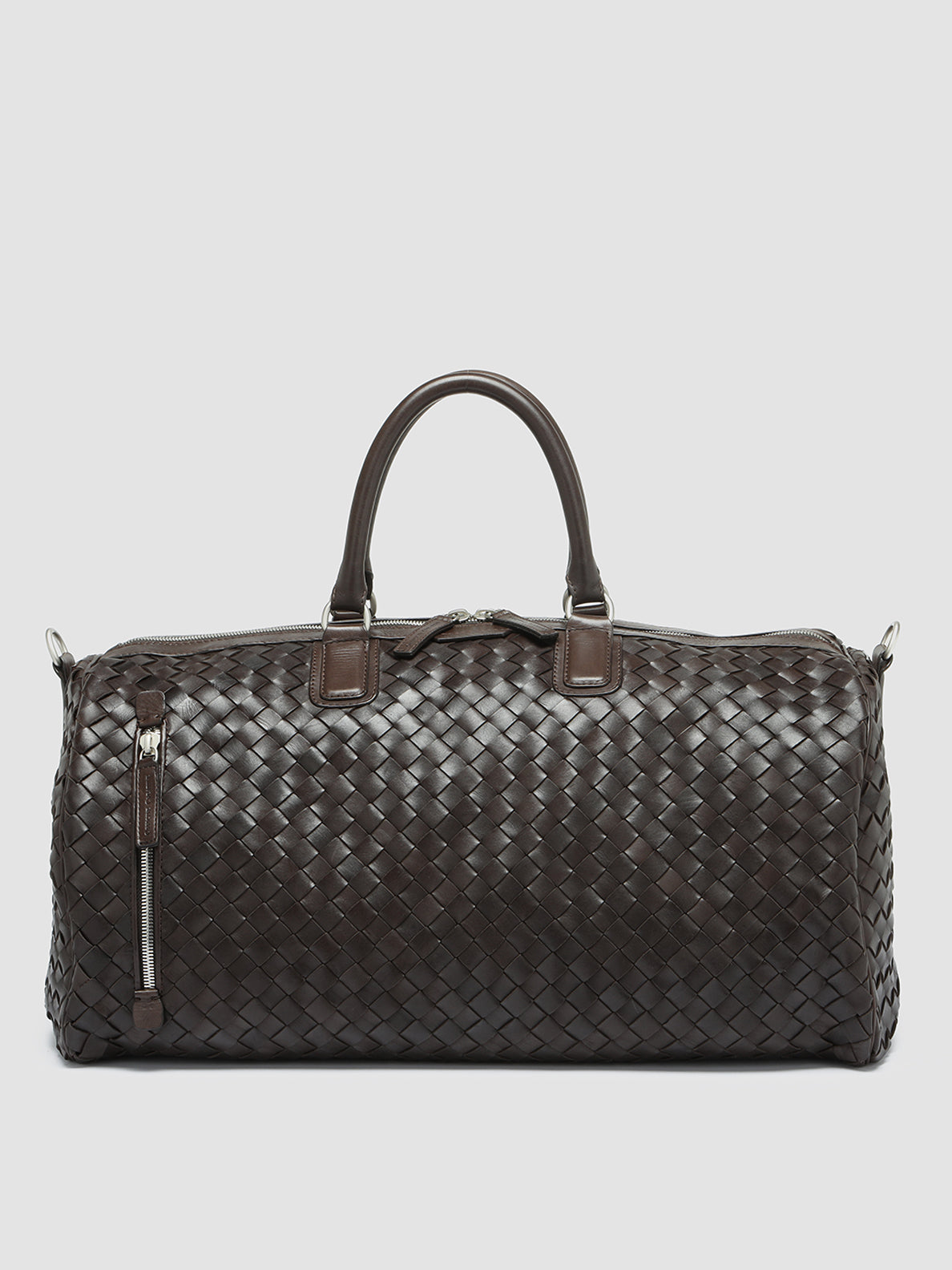 Our hand-woven leather Armor weekender features two top handles and an adjustable shoulder strap for easy carrying. The two-way zip in silver-tone metal that opens to reveal a spacious main compartment and the vertical front zip pocket make it the perfect bag for weekend getaways.