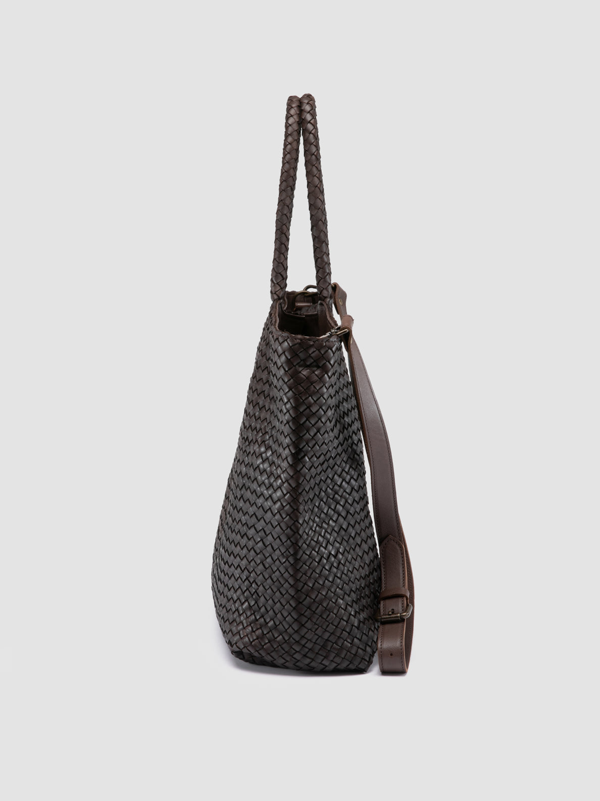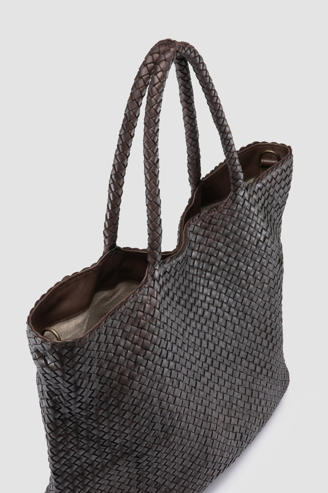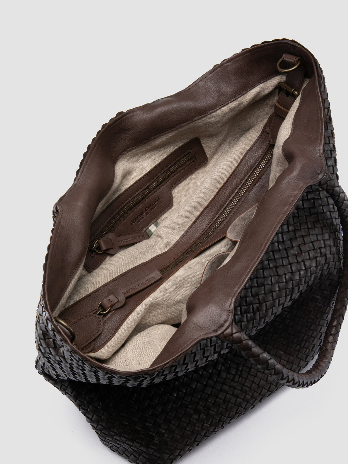 Our large OC Class tote bag combines timeless design and masterful craftsmanship. Hand-made in Italy with smooth woven leather, it features two top handles, a detachable shoulder strap, a spacious main compartment with natural linen lining and internal pocket, and gold-tone metal hardware.