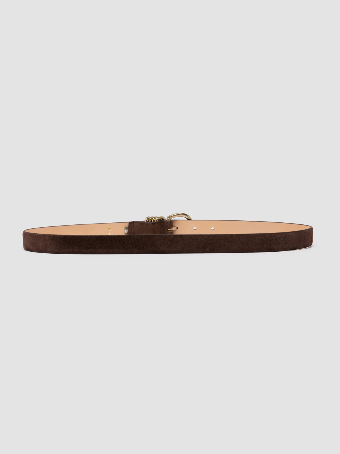 With the rich brown suede construction, the OC Strip 098 belt embodies understated sophistication. It features a rounded gold-tone metal buckle, multiple loop rings and a sleek pointed tip adorned with a signature metal detail.