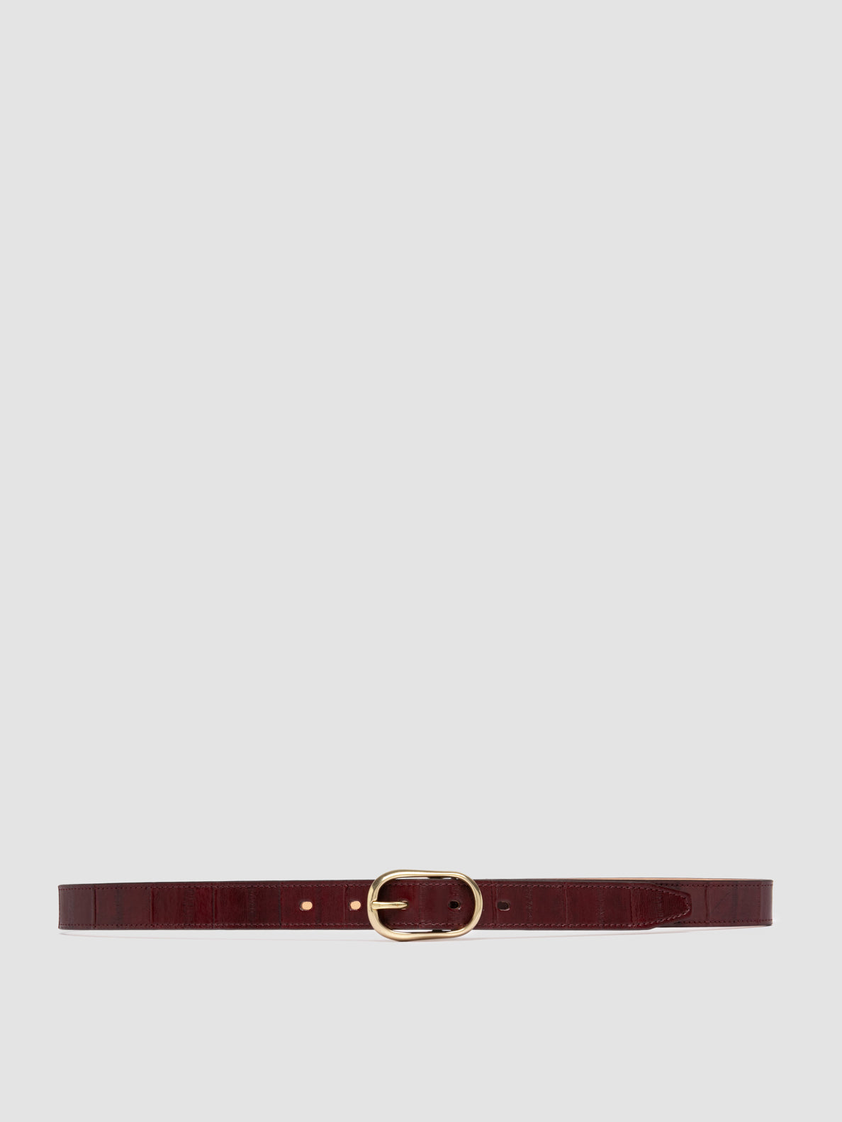 The OC Strip 099 belt is handcrafted from glossy burgundy leather with an embossed texture that enhances the sophisticated appeal. A gold-tone metal buckle adds a timeless finish, while the interior features discreet logo lettering.