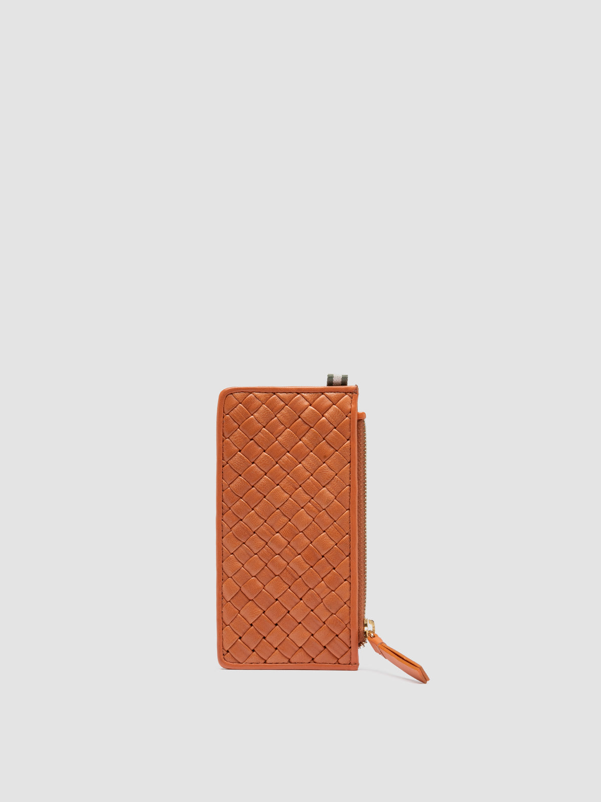 Made entirely by hand by our skilled craftsmen our Juliet card holder stands out thanks to its woven design in fine orange leather. It features a gold-tone metal zip-fastened compartment six card slots logo lettering printed at front and our signature grosgrain loop tab at the side.