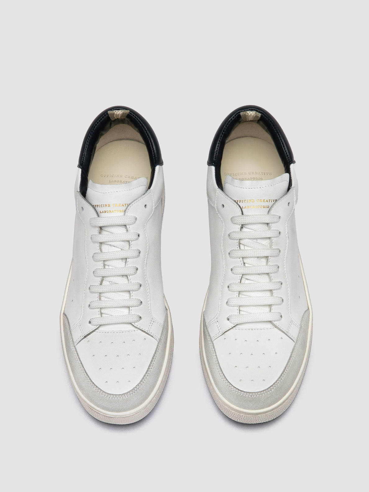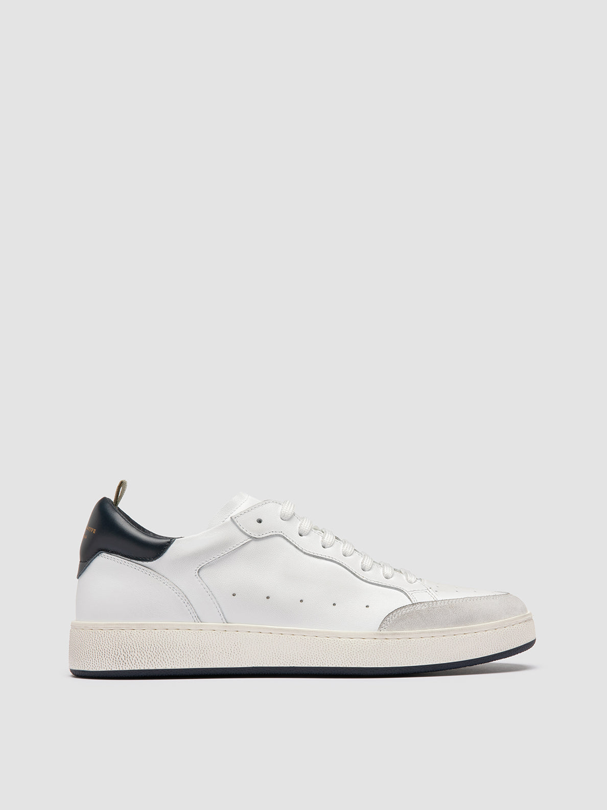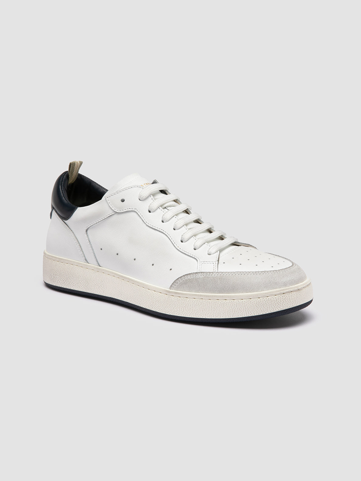 The Answer 007 sneakers are handcrafted in Italy from white leather. The design is elevated by a suede overlay at the toe and a blue heel patch, while the extra-light rubber sole ensures easy wear.
