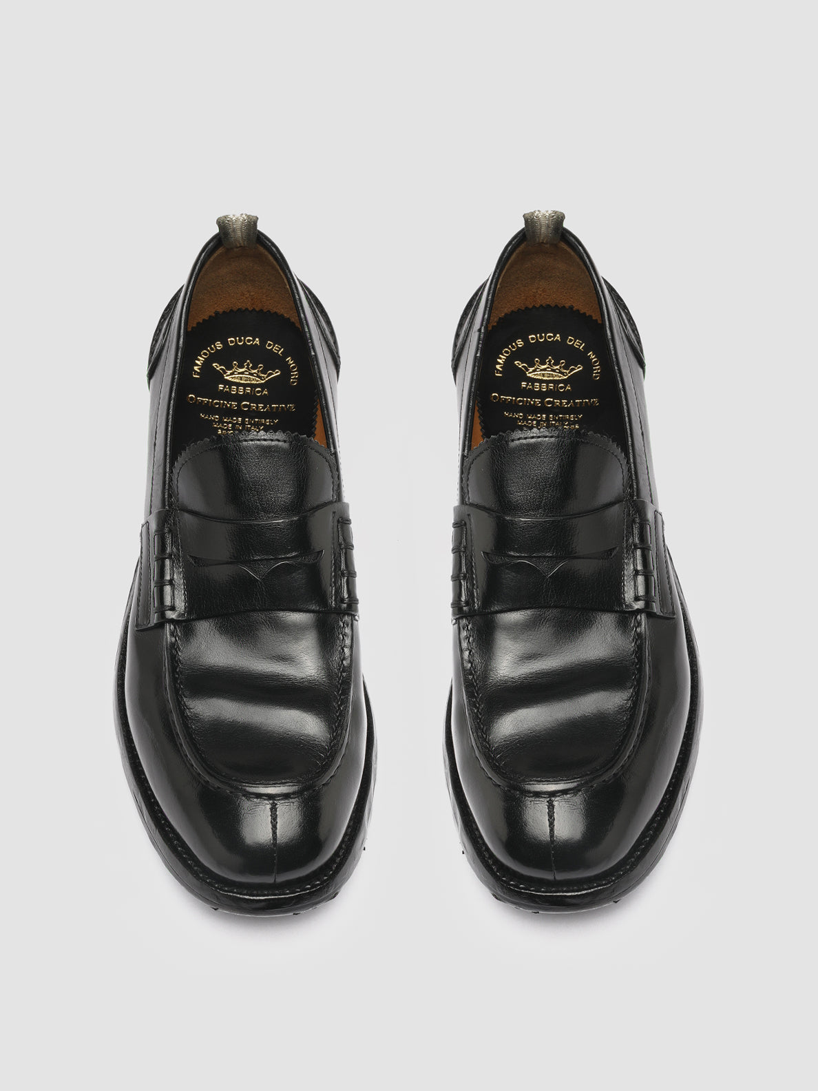 A sleek versatile and timeless design distinguishes our artisan Balance penny loafers in fine black leather. They feature a rounded almond toe highlighted by flawless tone-on-tone stitching a zig-zag finish tongue signature grosgrain heel loop-tab and a stacked leather sole with grip rubber inserts.
