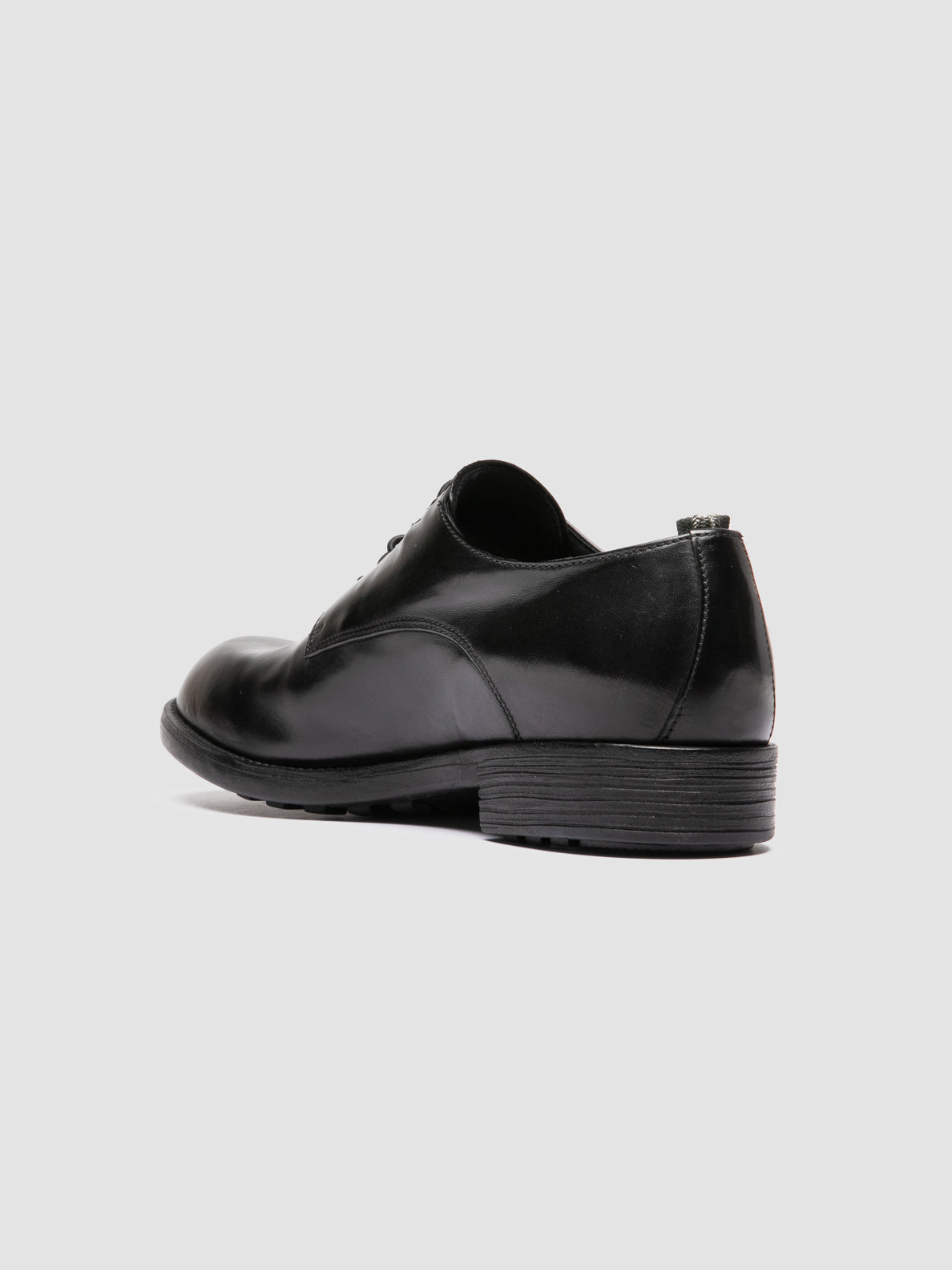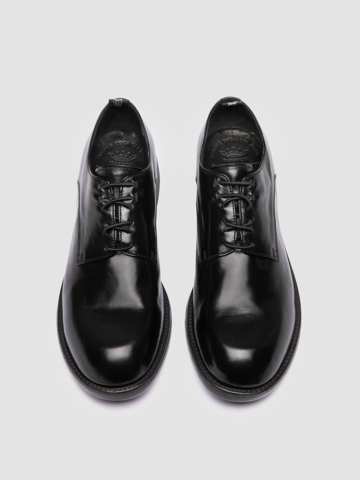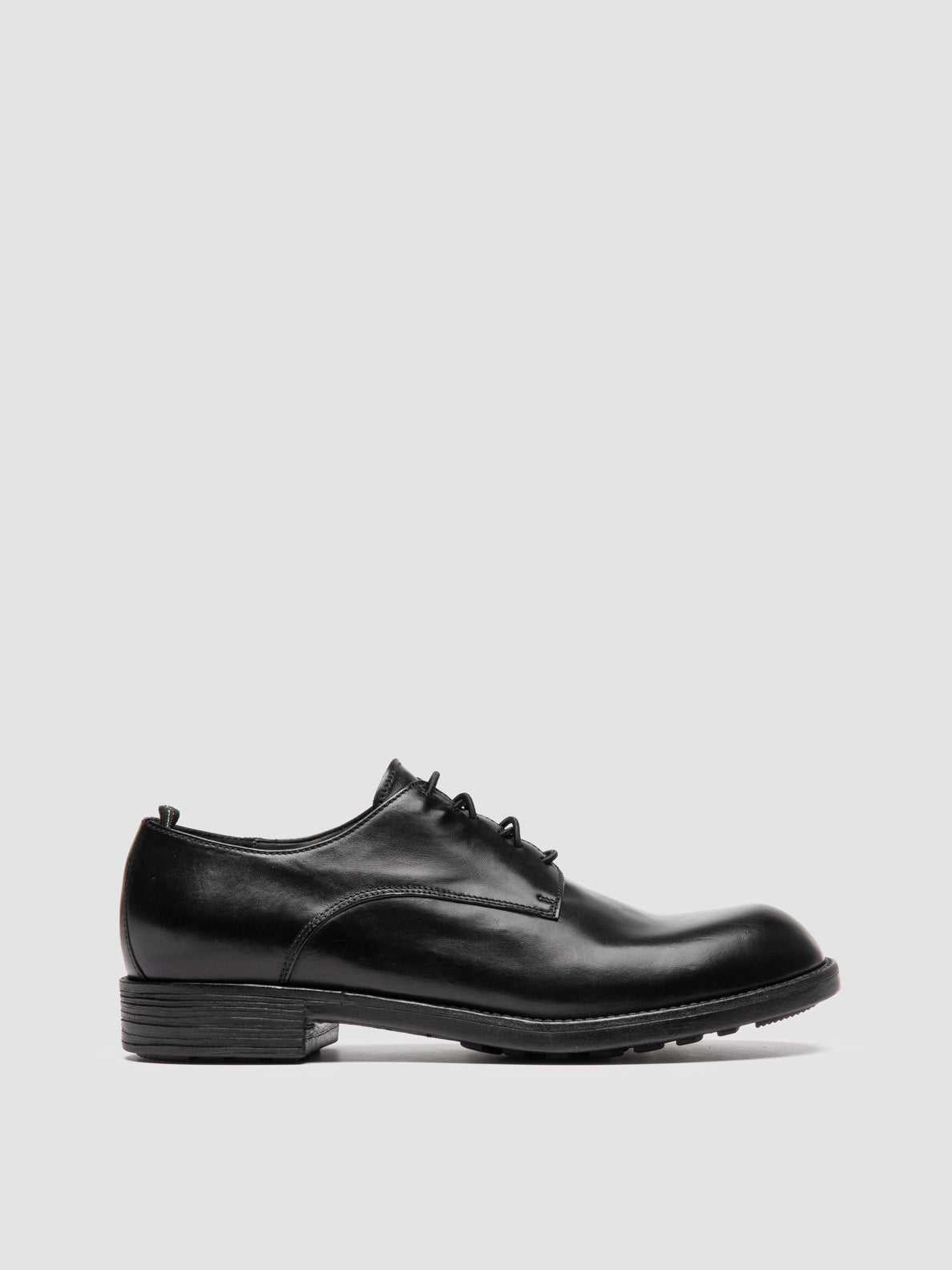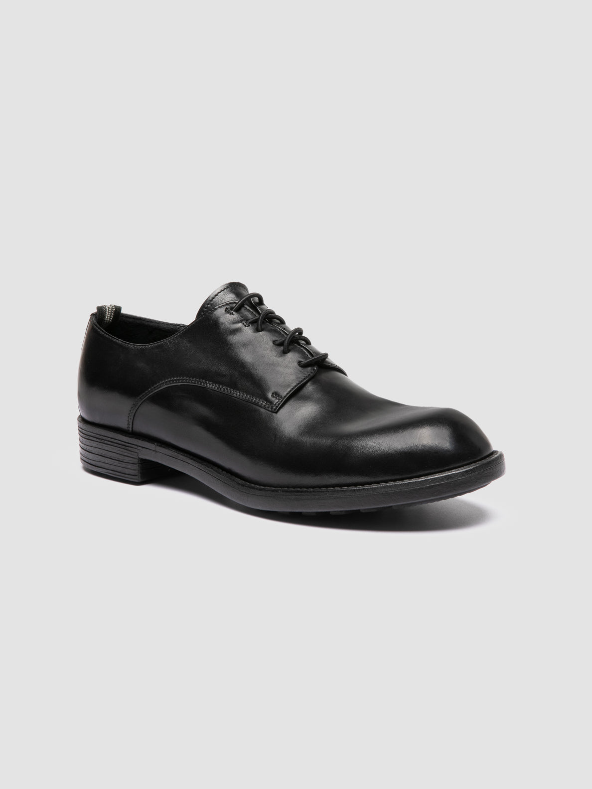 The Diary 009 Derby shoes are handcrafted from deep black leather with a deep-dyed finish. They feature a structured silhouette, classic lacing and a durable rubber sole for everyday wear.