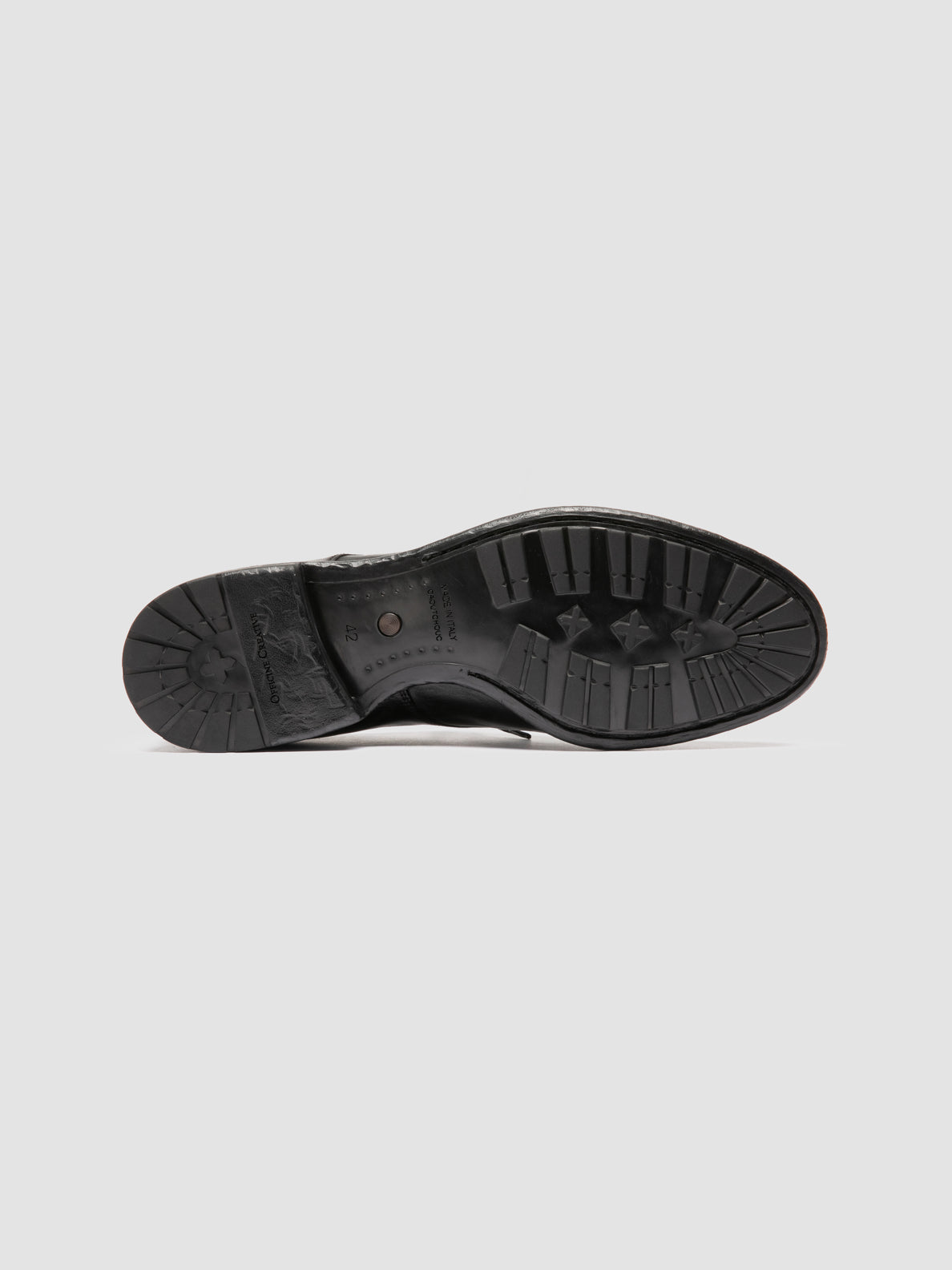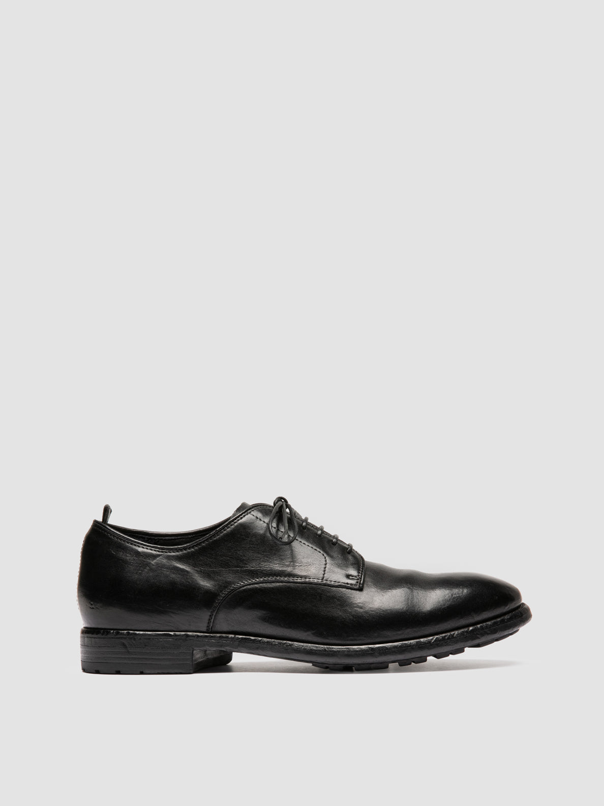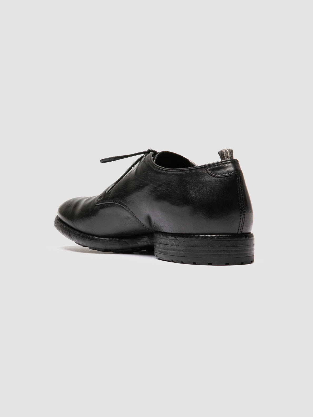 A versatile and timeless style characterizes our Prince artisanal derby shoes in black leather. Set on a sturdy rubber sole with low stacked heel they have a classic rounded almond silhouette slim waxed strings our sleek emblem engraved on the insole and the signature grosgrain rear pull-tab.