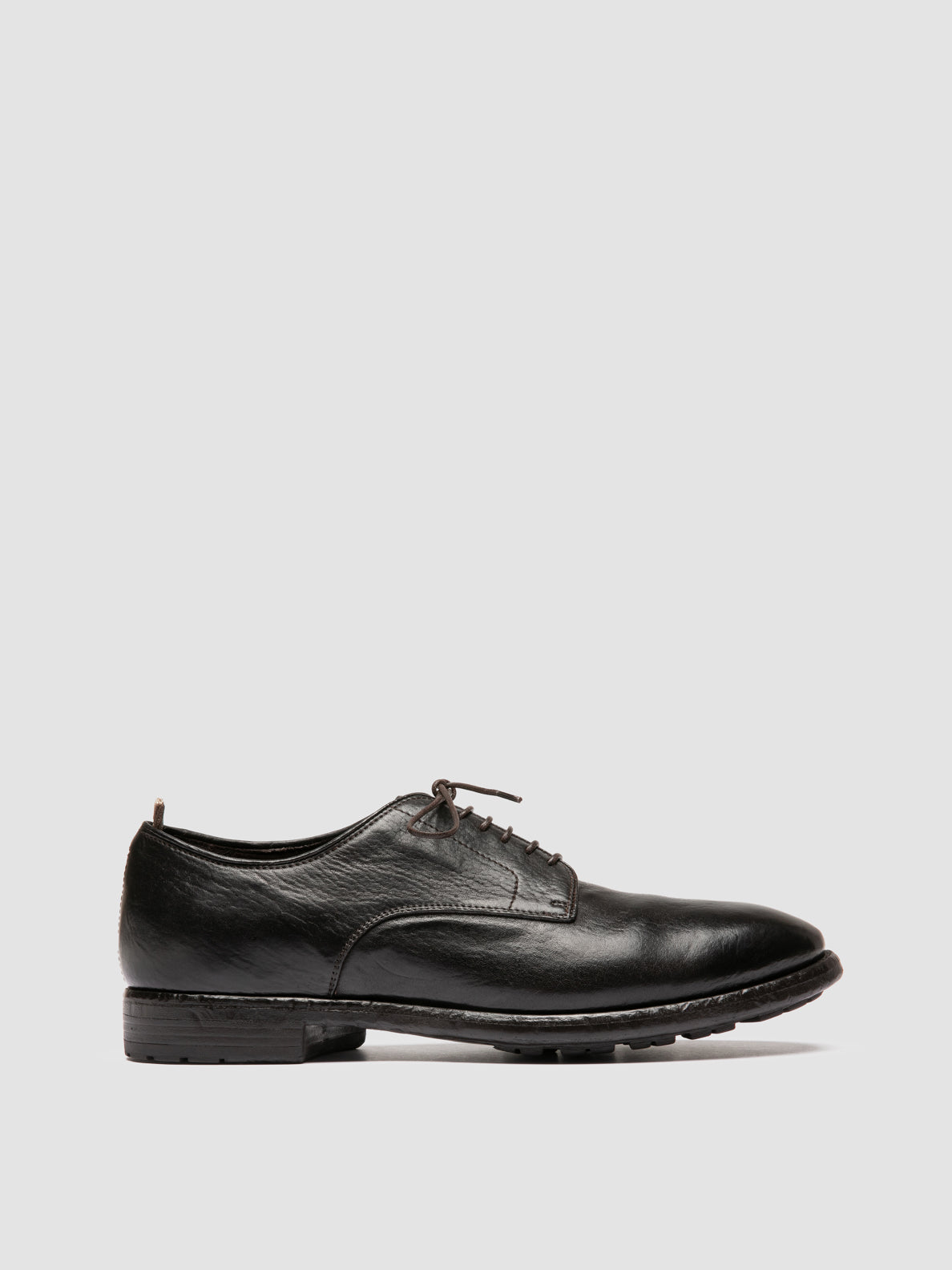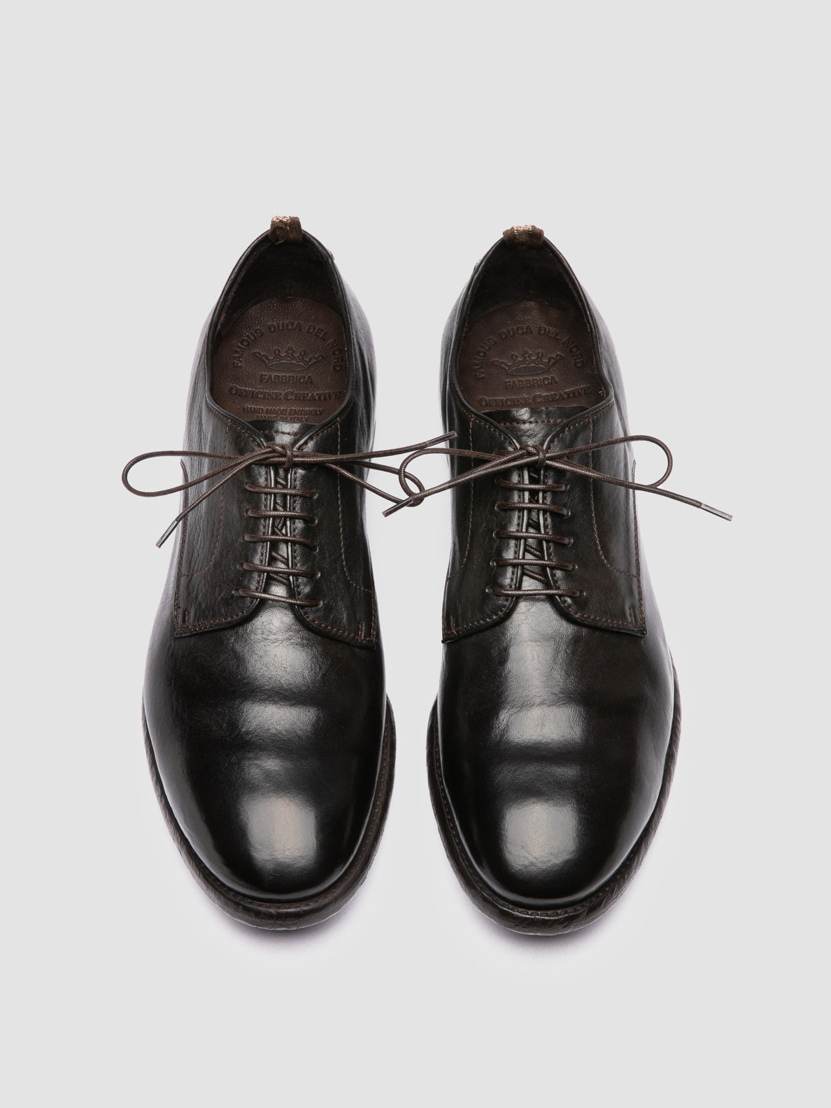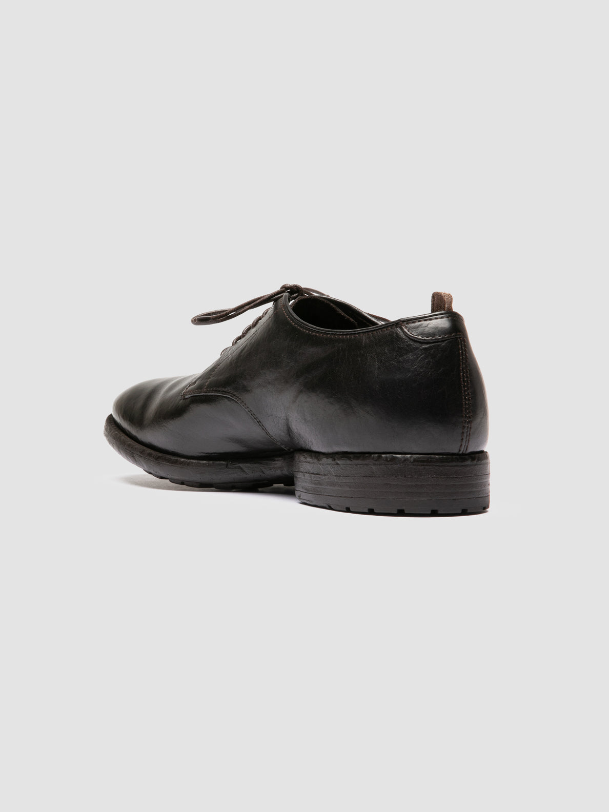 A versatile and timeless style characterizes our Prince artisanal derby shoes in dark brown leather. Set on a sturdy rubber sole with low stacked heel they have a classic rounded almond silhouette slim waxed strings our sleek emblem engraved on the insole and the signature grosgrain rear pull-tab.
